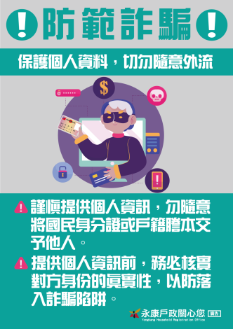 近日多位民眾反映接獲自稱戶政事務所人員來電或接獲語音訊息,聲稱您的身分證已遭冒用或有人持您的身分證或委託書來戶政事務所申辦戶政業務,若遇上述情形,可先行電洽向本所查詢(06)2326734或撥打165反詐騙專線求證。切勿依照電話指示操作或者直接回撥詐騙集團提供之電話號碼,並避免於電話中提供個人相關資料。