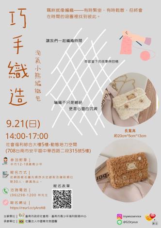一針一線來織夢,臺南青少中心邀您9月21日一同創造屬於自己的絨毛小熊包,詳洽06-2981200。