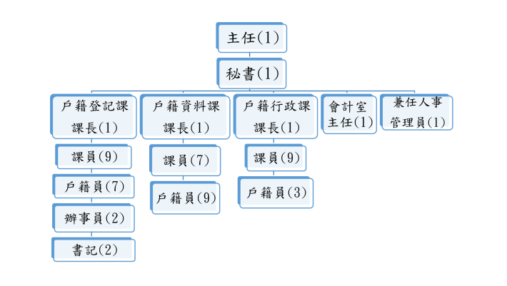戶籍登記課共21人:課長1人、課員9人、戶籍員7人、辦事員2人、書記2人