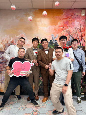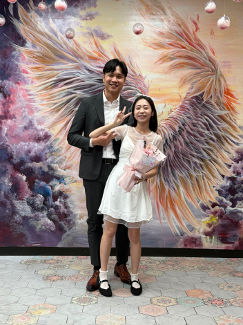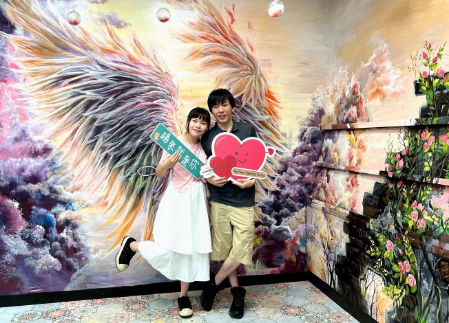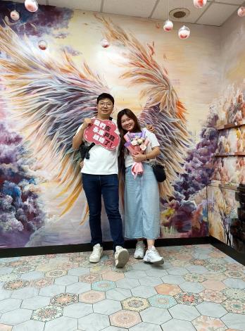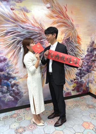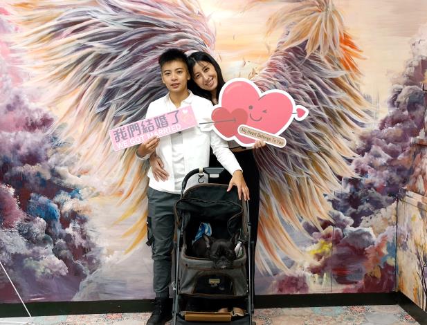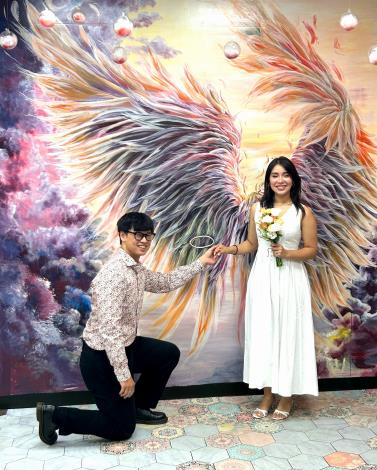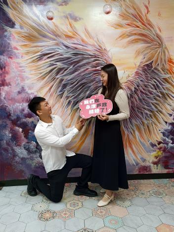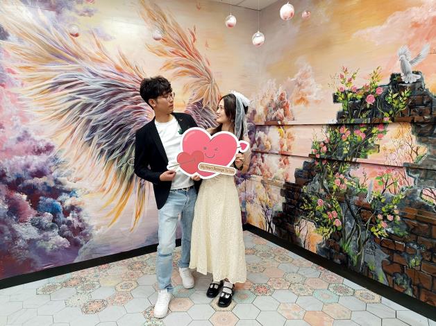 有別於常見的大圖輸出,本所結婚牆由同仁及家屬親自設計手繪,主視覺牆面,繪有一對於雲海上被陽光照射閃耀的天使羽翼,當新人站在前方就彷彿展翅飛舞於愛的天際,下方的光圈如同戒指般象徵著約定與承諾,新人可透過獻上光圈的動作許下愛情誓言;副視覺方面,輕盈飛翔的白鴿傳達祝福的信息,石牆上的玫瑰綻放幸福馨香,與主視覺相輝映讓人彷彿置身於童話世界;而天花板上懸吊的一顆顆透明塑膠球內都裝著羽毛及愛心,看起來就如同泡泡將天使的羽毛及新人的愛,承載至結婚專櫃,打造一體感的結婚區域。