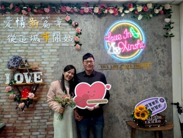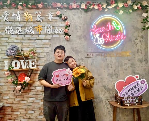以新市區產業的結構變化為設計發想,新市早年係以農業作為主要經濟產業,直至民國84年左右南部科學工業園區籌設後產業類型轉變為工農業混合,而本所以代表農村「紅瓦厝」的紅磚及帶有工業感的斑駁水泥牆為基礎,搭配具工業風格且包含在地農產特產元素(毛豆及白蓮霧)的霓虹燈具,打造工業風主題的結婚拍照區,除了象徵新市區的變遷及發展,也隱含婚後愛情邁入新階段之寓意,希望帶給新人特別的拍照氛圍。